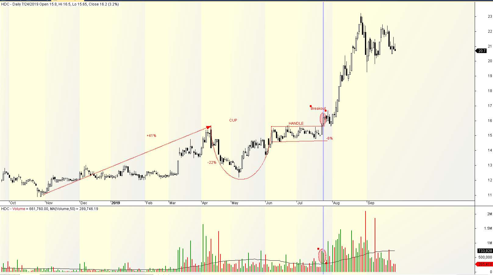1. Tay cầm có ít nhất 5 ngày giao dịch. Hầu hết các tay cầm nên có thời gian ít nhất 1 tuần giao dịch. Lý tưởng, chiều dài tay cầm nên có tỷ lệ với nền giá. Nghĩa là phần cốc hoặc hai đáy càng dài, thì tay cầm có thể dài hơn. (Note: Tuy nhiên, trong thực hành tôi không tuân thủ hướng dẫn này. Đừng cố gắng khống chế thời gian của tay cầm. Đôi khi thời gian hình thành của tay cầm sẽ rất dài. Xem ví dụ về mã cổ phiếu HDC. Thời gian hình thành tay cầm là gần tương đương với thời gian hình thành phần cốc).